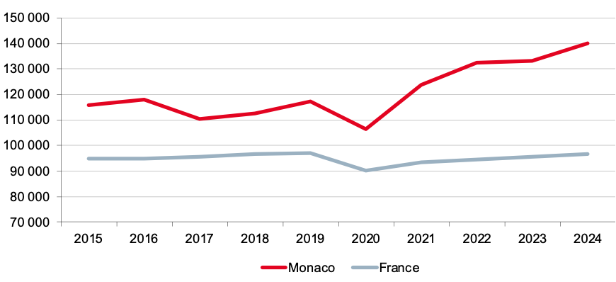 En comparaison avec son homologue français, le PIB par salarié monégasque reste largement supérieur et l’écart se creuse encore cette année. En effet, le PIB par salarié français n’a progressé que de 1,1 % en 2024 (contre 5,2 % à Monaco). Il est ainsi supérieur de 45,1 % en Principauté (+43 504 euros), soit plus du double de l’écart observé dix ans auparavant.