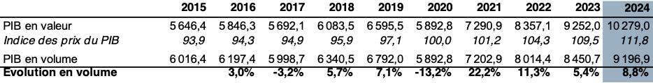 En 2024, le PIB « per capita » dépasse nettement les 100 000 euros. La population de référence ayant augmenté de 2,5 %, la croissance du PIB « per capita » est mathématiquement inférieure à celle du PIB. Celle-ci atteint tout de même 6,2 % en volume.