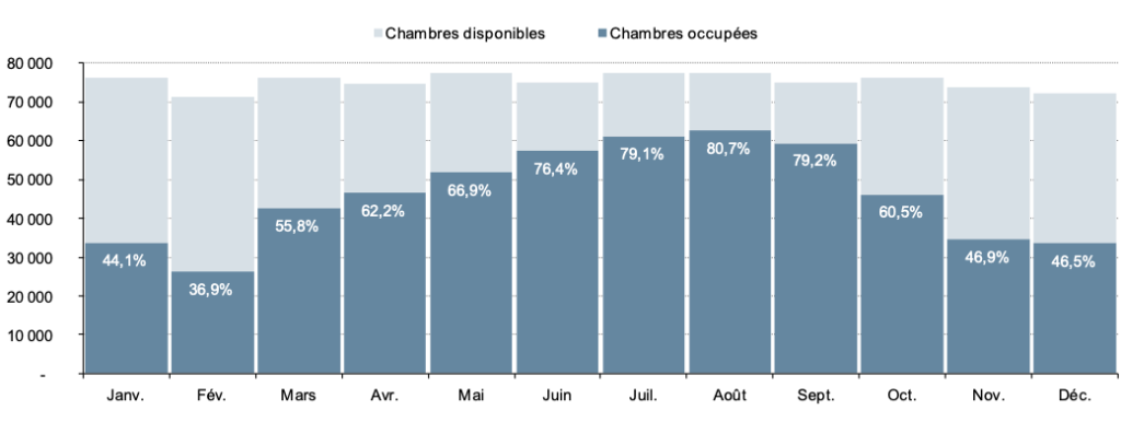 Répartition du nombre de chambre disponibles, occupées, et taux d’occupation dans les hôtels selon le mois en 2024