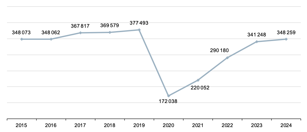 Les hôtels de la Principauté ont enregistré 348 259 arrivées personnes en 2024, marquant une hausse de 2,1 % par rapport à 2023, soit 7 011 visiteurs supplémentaires. Comparée à 2021, la progression atteint 58,3 %, avec 128 206 arrivées de plus. Malgré cette dynamique positive, la fréquentation demeure toujours en retrait par rapport au record historique de 2019, qui comptabilisait 377 493 arrivées.