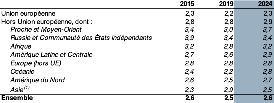 Les visiteurs de nationalités issues de pays hors Union européenne restent les plus longs à séjourner, avec une moyenne de 2,9 nuits, contre 2,3 pour ceux venant de l’UE. Certaines zones géographiques affichent des durées particulièrement élevées, comme le Proche et Moyen-Orient (3,7 nuitées), la Russie et la Communauté des États indépendants (3,4 nuitées) ou l’Afrique (3,2 nuitées). Ces données confirment l’importance stratégique des clientèles lointaines, qui tendent à prolonger leur séjour.