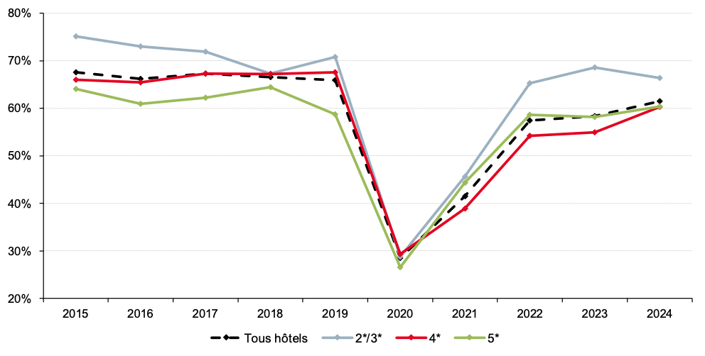 En 2024, les quatre hôtels classés 4 étoiles et leurs 503 616 chambres disponibles sur l’année enregistrent un taux d’occupation de 60,3 %, en progression de 5,3 points par rapport à 2023 (55,0 %) mais encore en deçà du niveau de 2019 (67,6 %). Les quatre établissements 5 étoiles, avec 226 555 chambres disponibles, sont les seuls à dépasser leur niveau d’avant-crise, affichant un taux d’occupation de 60,4 %, contre 58,8 % en 2019 et 58,2 % l’année précédente. Enfin, les cinq hôtels classés 2 et 3 étoiles, qui totalisent 173 515 chambres sur l’année, présentent le taux d’occupation le plus élevé en 2024, à 66,4 %, bien qu’en recul par rapport à 2019 (70,8 %) et à 2023 (68,6 %).